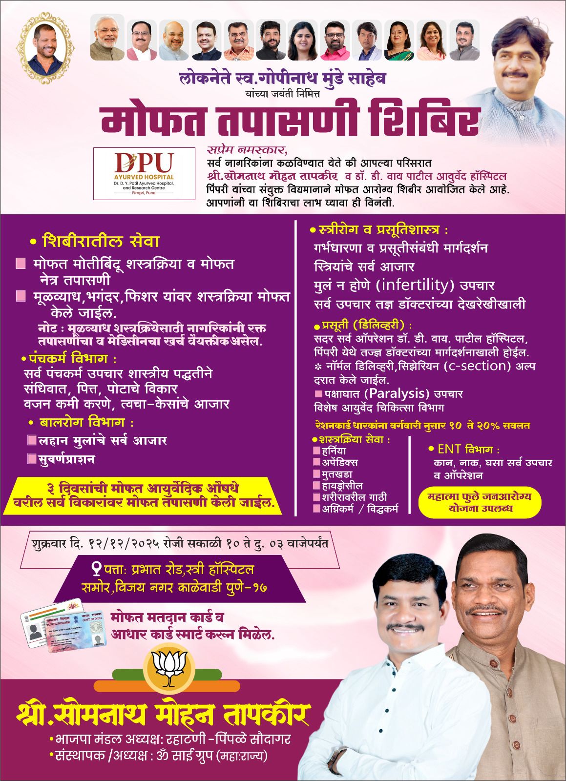 स्व. लोकनेते गोपीनाथ मुंडे साहेब यांच्या जयंती निम्मित मोफत आरोग्य तपासणी शिबीर आयोजित कारण्यत आले असून प्रभाग क्रमांक :22 काळेवाडी- विजयनगर मधील सर्व नागरिकांनी उपस्थित राहून आरोग्य शिबीर चा लाभ घ्यावा.